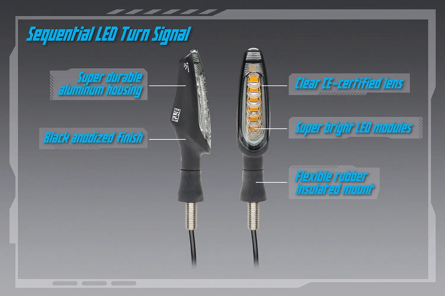 - CE certified set of sequential two-wire LED lights with a clear lens, anodized black aluminum body in a rubber insulated mount to decrease vibration.