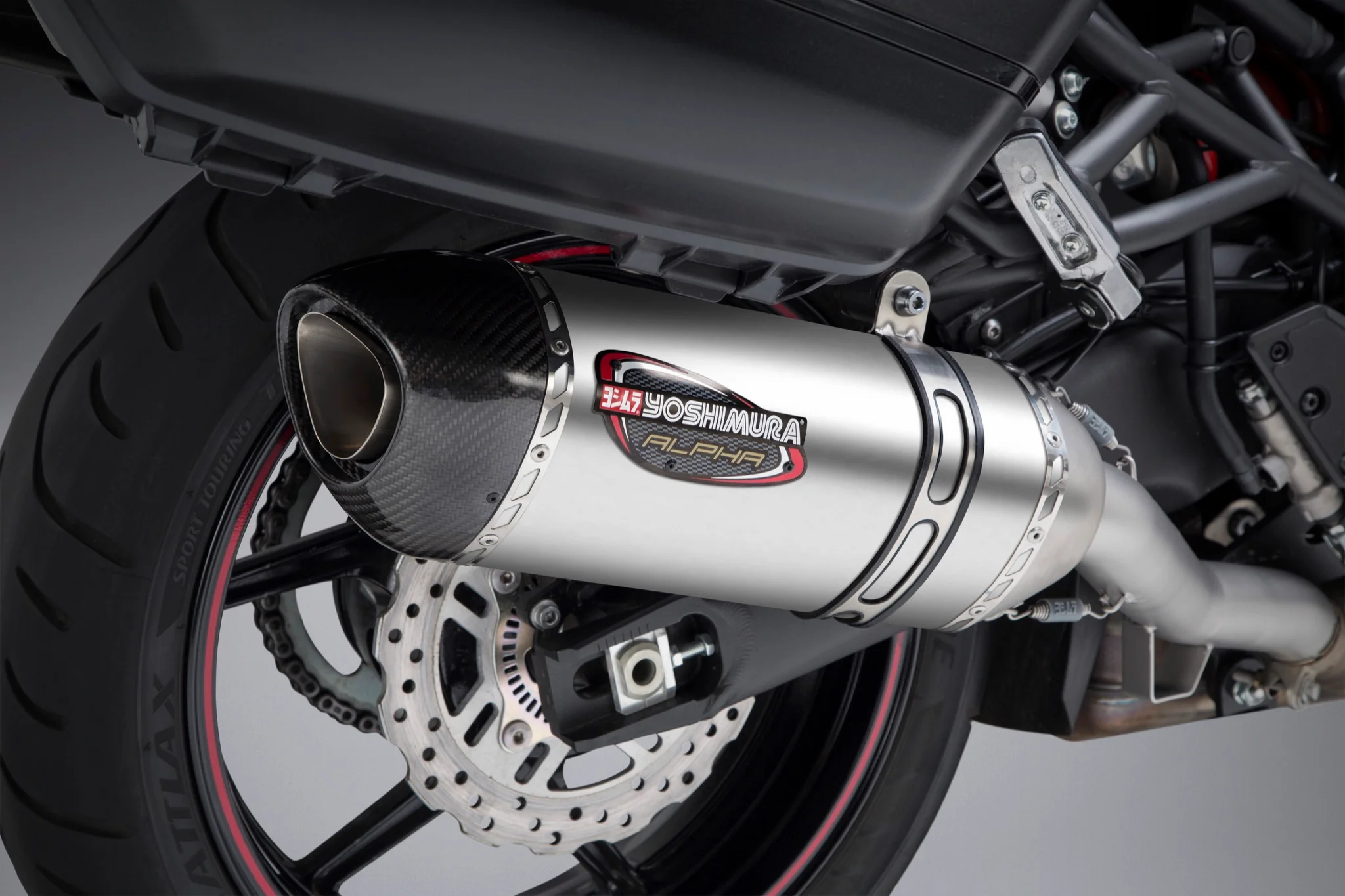 At Yoshimura we always make it better. So we took the big Versys 1000 and went to work on creating an exhaust that can enhance all of its attributes. We developed our Alpha muffler for the job of taking on just such a task. Massive weight savings are achieved, over half the weight of the stock muffler has been shed. 9 pounds to be exact! If its power and torque you want, our Alpha answers that call too. With a consistent power and torque curve we added a strong 3% to the max. HP and a whopping 10% to the max. torque. If you own a Versys 1000 LT this is the exhaust for you!